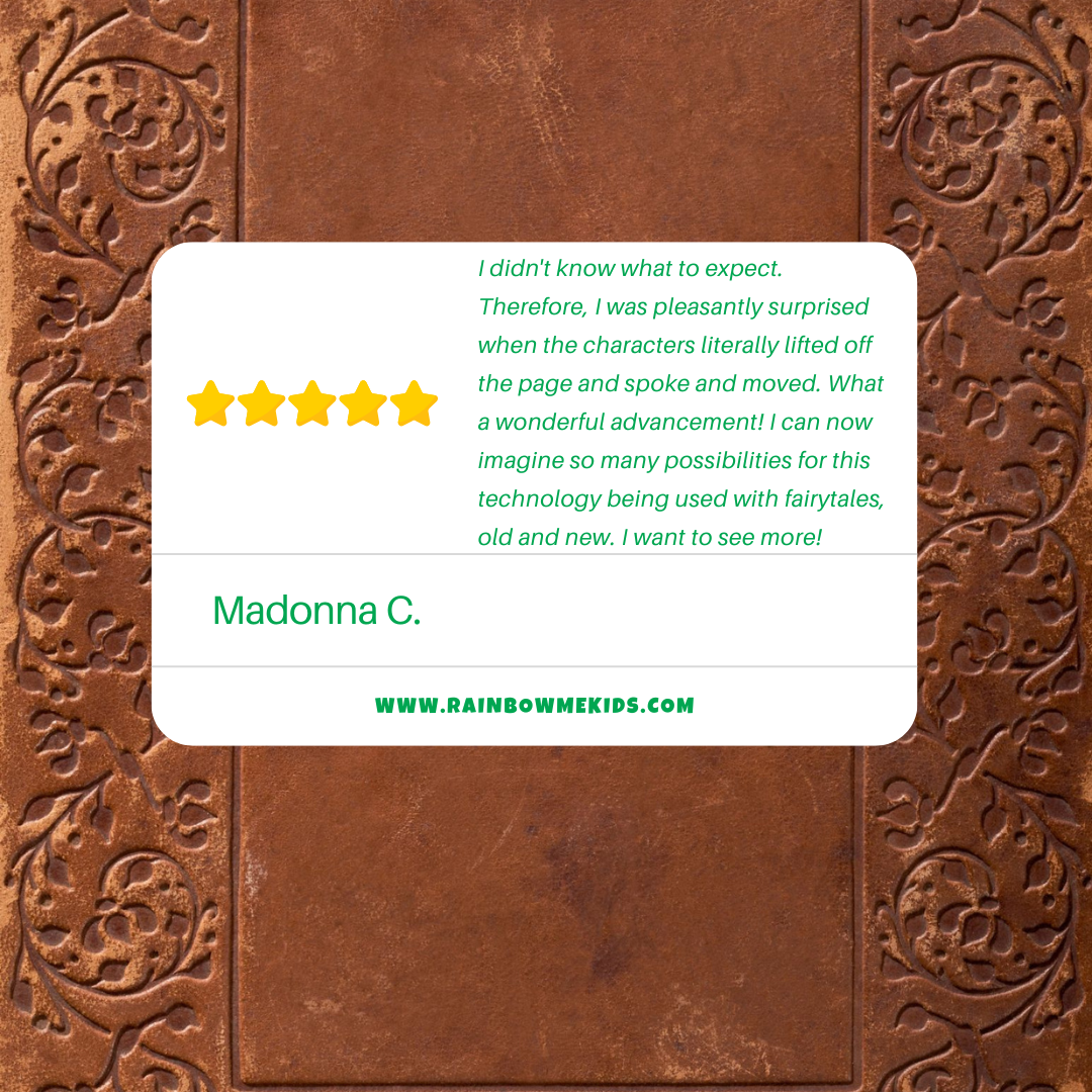 In real life, RainbowMe Kids uses AR (Augmented Reality) to bring those same stories to life in your hands.